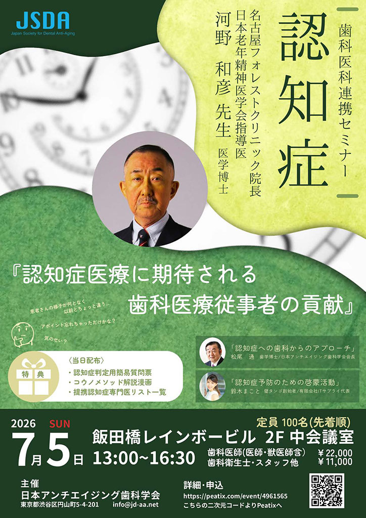 当学会はアンチエイジング歯科に関する研究、 研修、教育により、歯科医療の診断と治療に広くアンチエイジングが導入応用されることを目指しております。